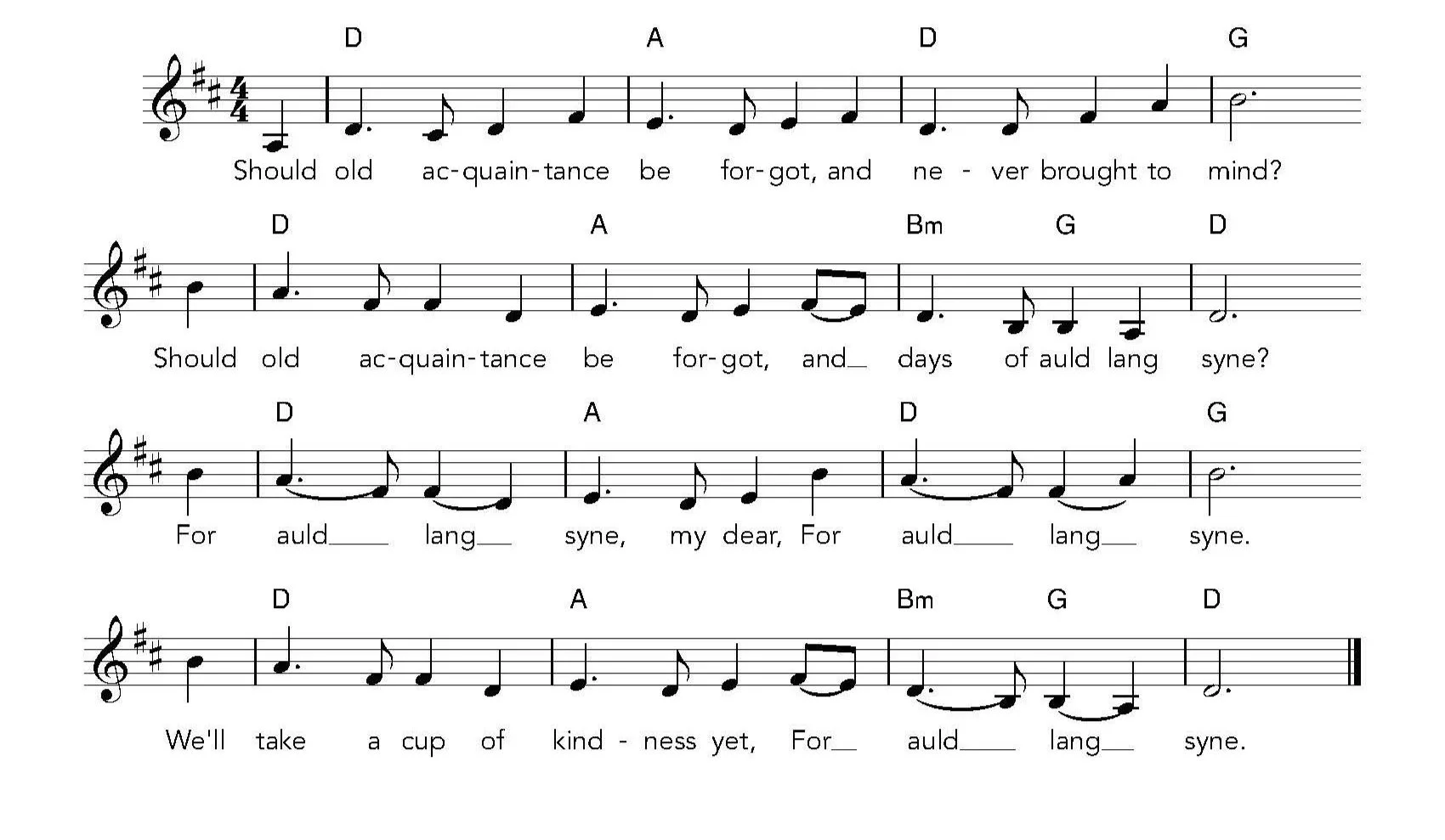 Auld Lang Syne is a folksong from Scotland, which people typically associate with friendship, New Year’s Eve, remembering the past, and the coming of the New Year. The text is attributed to the poet Robert Burns, who penned the lyrics in 1788. A few years later, the text was set to music, and the tradition of singing Auld Lang Syne on New Years Eve started during the 1800s. The literal translation of the Gaelic “auld lang syne” is “old times since,” and is taken to mean “for old time’s sake” or “times gone by.”